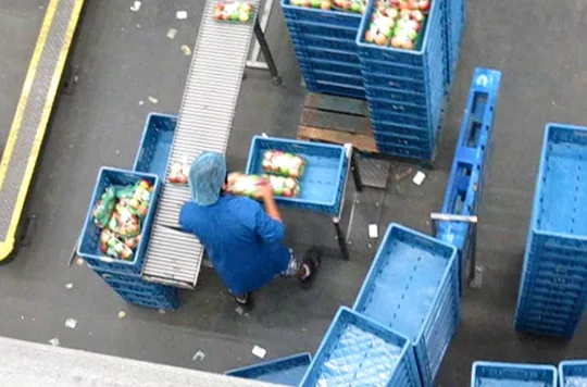 De operator staat aan het einde van een inpaklijn. Hij neemt de ingepakte schaaltjes met appelen van de rollenbaan en legt deze in de blauwe fruitbak. De volle bak tilt hij vervolgens op de pallet. Deze staat van laag tot hoog gevuld. De ergonomische risico’s zijn dan: