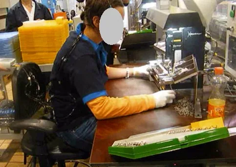 Deze medewerkster neemt een lamp en legt deze voor haar op het stellasapparaat. Vervolgens neemt ze verschillende component en legt deze op de fitting om ze erop vast te lassen. De afgewerkte lamp wordt op de groene tray gelegd. Volgende risico’s uit de Ergonomie Check zijn op deze werkpost aanwezig: