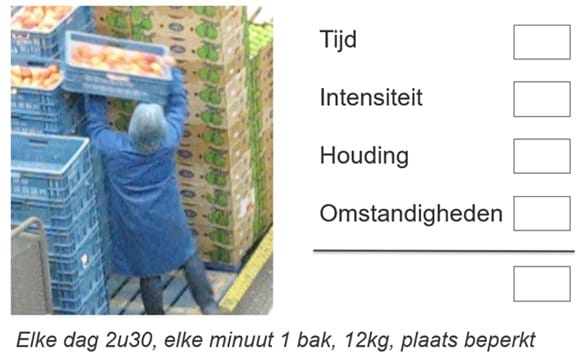 De operator zet volle bakken fruit klaar aan een inpaklijn. Ze voert deze taak 2u30 per dag uit en zet elke minuut een bak van 12kg klaar op de inpaktafel. De bakken worden aangevoerd op een pallet van grondniveau tot 2m20 hoog. Dat betekent sterk buigen in de rug en hoog reiken vanuit de schouders. De bakken hebben een handvat, maar de controle over de bak en de ruimte om een bak te bereiken zijn soms beperkt.