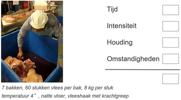 De operator neemt stukken vlees uit de blauwe bufferbakken. Dit is een job tussendoor. Op 1u20 verwerkt hij zeven bakken met telkens 60 stukken vlees erin. Hij heeft een vleeshaak met handvat zodat een goede grip verzekerd is. Een stuk vlees weegt 8kg. De bakken zijn diep en de transportband staat loodrecht op de bak. Dat betekent sterk buigen om het vlees te nemen en draaien om het op de band te leggen. De ruimte tussen de bakken is beperkt (<90cm) en de ondergrond is wat glad van het vleessap.