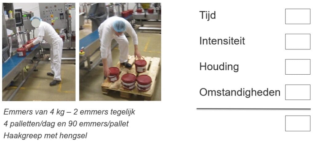 De operator neemt de emmertjes van de lage transportband en zet deze op een pallet. Hij neemt twee emmertjes tegelijk, één in elke hand. Een emmertje weegt 4kg. Het hengsel van de arm is smal, maar laat een haakgreep toe. Op de pallet passen 90 emmertjes en de operator vult 4 palletten per dag. Dat is 180x per dag 2 emmertjes tillen. Tussendoor controleert hij de hele productielijn.