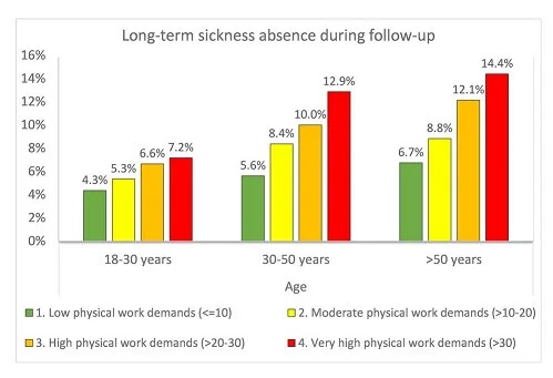 De beroepen met de laagste fysieke belasting, met een ergonomie index van minder dan 10, gelden als referentie. Bij de jonge medewerkers (20 jaar) vertoonde de groep die fysiek zwaar werk deden, 17% meer langdurige ziekte. Dit effect nam toe met de leeftijd tot 57% meer langdurig ziekteverzuim bij de 40-jarigen en tot 109% voor de 60-jarigen. Dat is meer dan dubbel zoveel. De impact van de fysieke belasting neemt dus toe met de leeftijd.