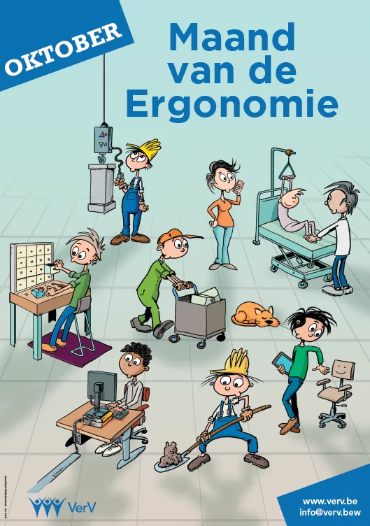 Oktober is maand van de ergonomie. Ergonomie is mensgericht ontwerpen van systemen met het welzijn van de mens en de prestatie van het systeem als dubbel doe. Kort gezegd, ergonomie is de omgeving aanpassen aan de mens. Wil je ergonomie mee in de kijker zetten, dan vind je hieronder wat beeldmateriaal van VerV, Beroepsvereniging voor Ergonomie. Klik op de figuur om de pdf in hoge resolutie te downloaden.