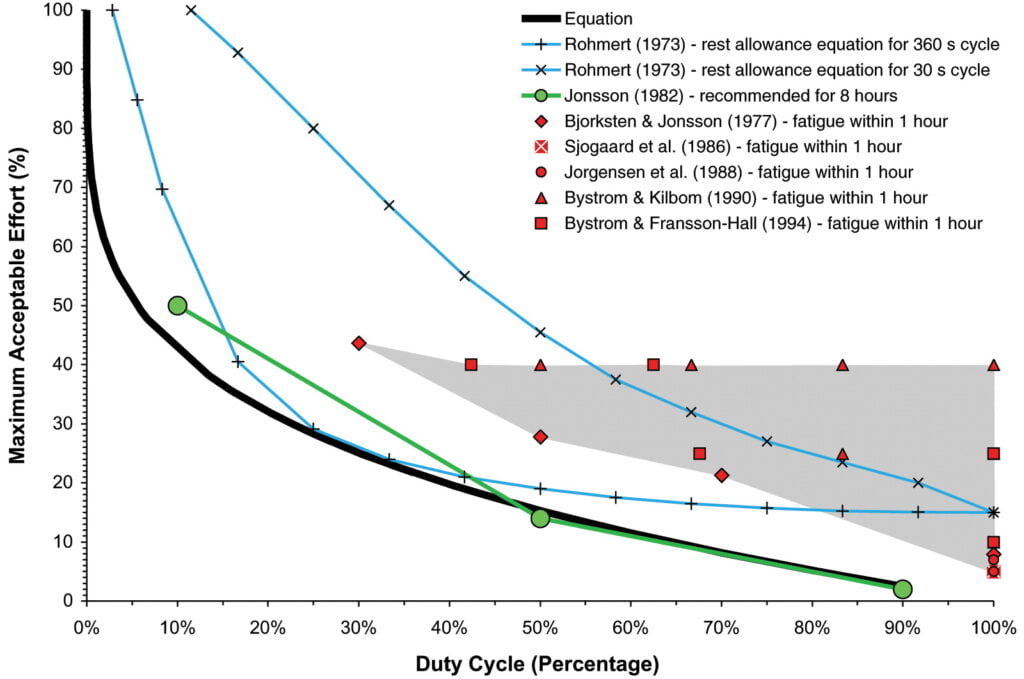 Omgekeerd kan men ook berekenen hoeveel % van de cyclustijd men een bepaalde kracht kan volhouden zonder lokale spiervermoeidheid. Een kracht van 15% van het maximum kan men maximaal 50% van de cyclustijd volhouden. Dat gaat bijvoorbeeld in tegen de Rohmert curve voor het beoordelen van statische belasting, die stelde dat men een kracht van 15% MVC onbeperkt kan volhouden.