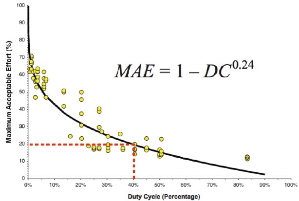 Wanneer men gedurende 40% van de cyclustijd een kracht uitoefent, is de duty cycle (DC) 0,4. De maximale aanvaardbare kracht is dan 20% van het maximum of MAE = 0,2. Een medewerker oefent gedurende vier seconden een krachtgreep uit op een cyclustijd van 10 seconden (DC = 0,4). De maximale aanvaardbare kracht voor P25 vrouwen is 25kg grijpkracht. Wanneer deze krachtgreep 4/10s wordt uitgeoefend, is de aanvaardbare kracht nog 5kg (25kg * 0,2).
